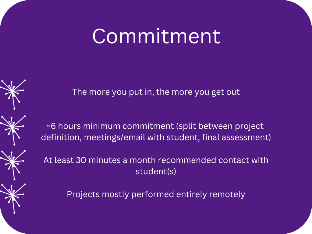 Be it development of a product or strategy, analysis of data, a feasibility study, or something else, there will be a student with the skills to help!